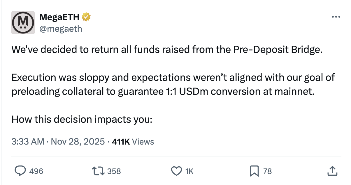 MegaETH will return all user funds from its pre-launch Pre-Deposit Bridge due to a chaotic and disorganized fundraising attempt.