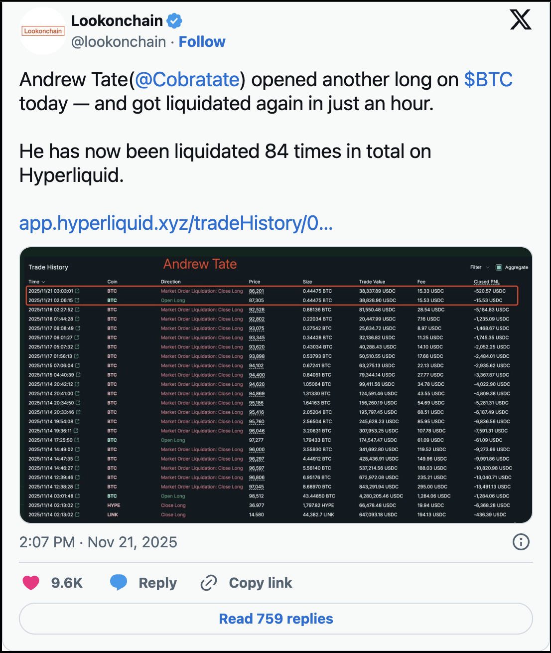 Andrew Tate has taken another hit on Hyperliquid. The controversial influencer opened a fresh long position on Bitcoin late on November 20. Only to watch it get liquidated less than an hour later. This marks his 84th liquidation on the platform. Adding yet another chapter to a trading streak the internet refuses to let him forget.